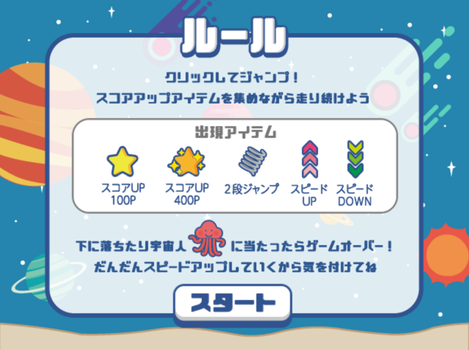 下に落ちたり、宇宙人にあたったらゲームオーバー
