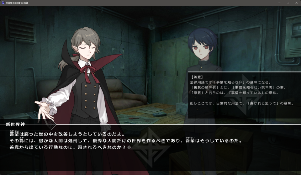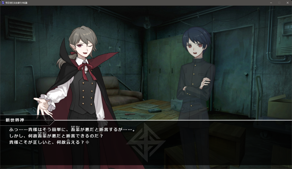 刑法の概観をコメディタッチに解説した短編ノベルゲームです。