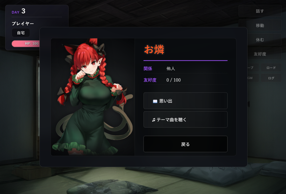 プレイヤーは1日の間に「移動」「話す」「休む」等ができます。