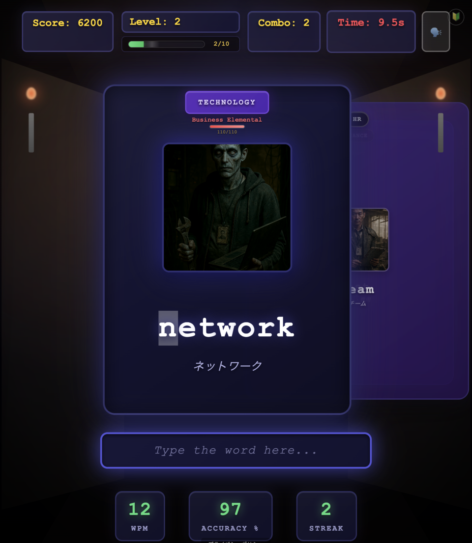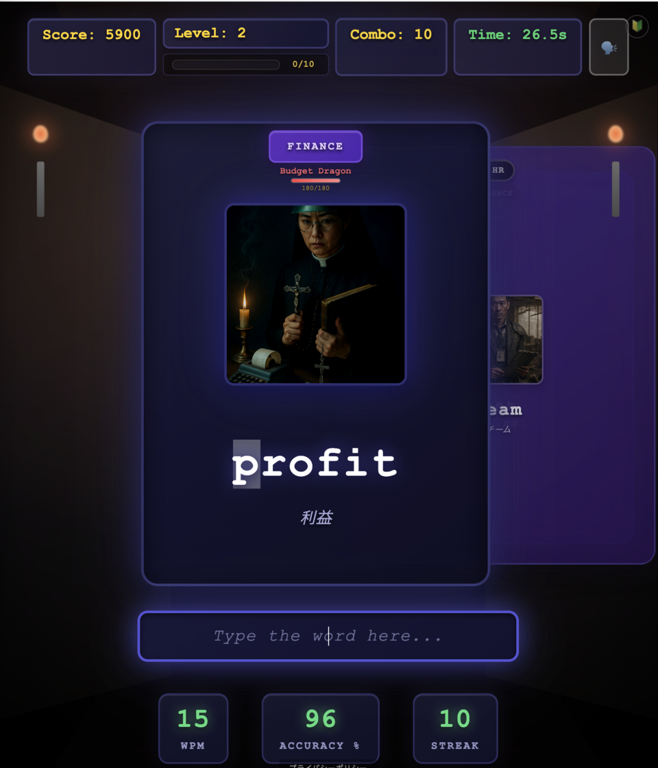 営業、エンジニアリング、マネジメント、財務、人事など職種別に厳選された専門用語を、ゲーム感覚で効率的にマスターできます。 ダンジョンテーマの世界観で、タイピングスキルとビジネス英語力を同時に向上。