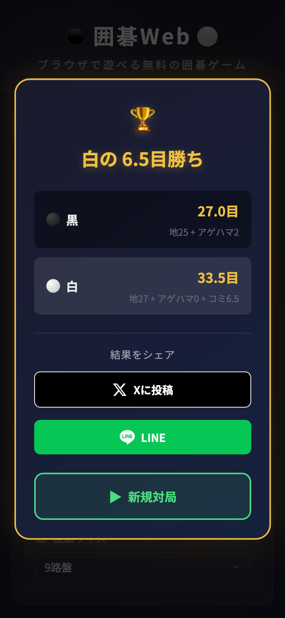 対戦結果はX(Twitter)やLINEでシェアできます。