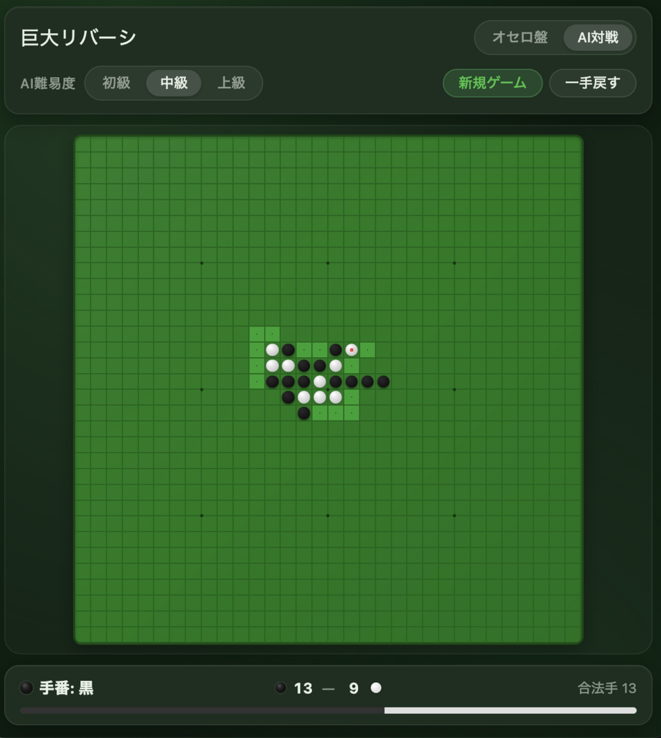 32マスの巨大盤面を使って、AIとの対戦や対人戦を楽しめます。