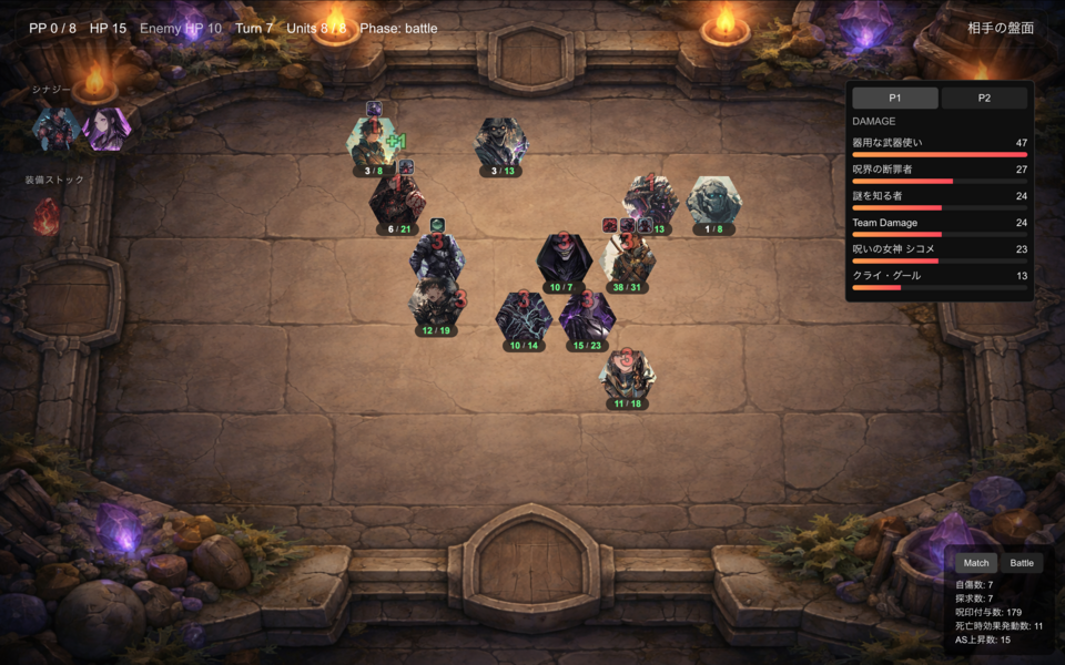 初の制作ゲームですが、オートバトラーの「重なり」の楽しさと、カードゲームの「奪い合い」の緊張感を1つに凝縮しました。