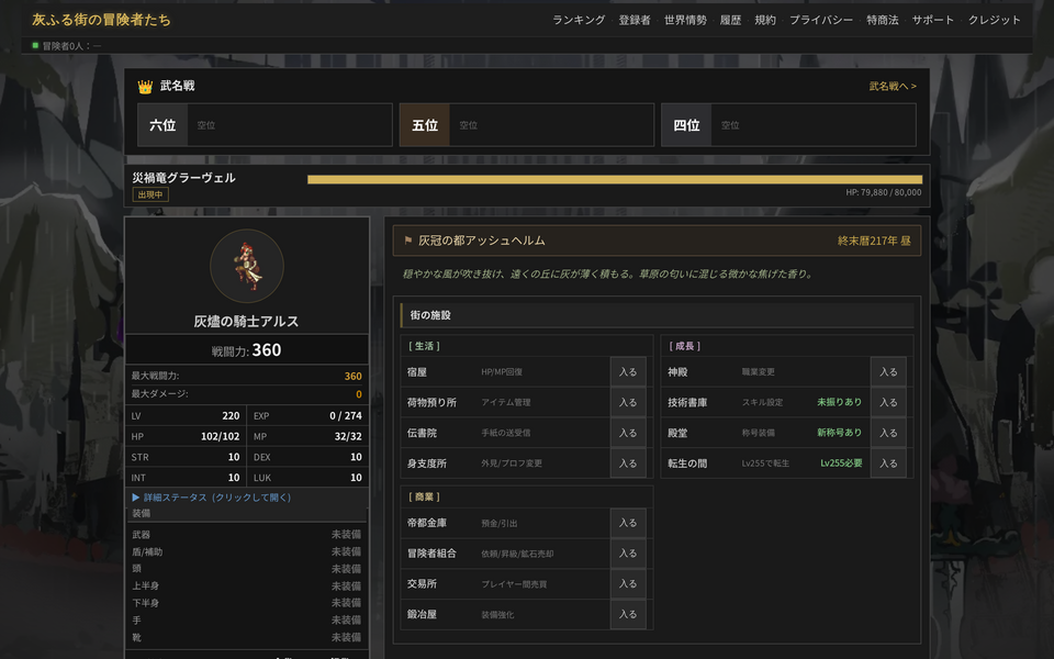 灰が絶えず降り注ぐ終末世界「アッシュヘルム」を舞台にしたブラウザRPG。