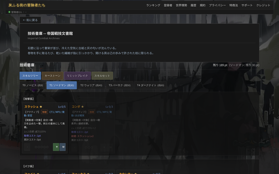 探索・スキルツリー・鍛冶・武名戦・交易所・転生など主要機能実装済み。