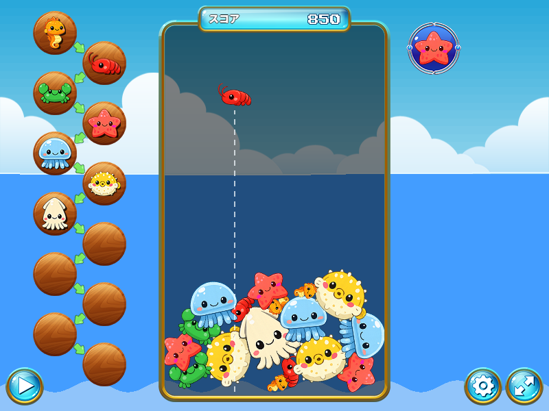海の生き物を落として合体させるパズル