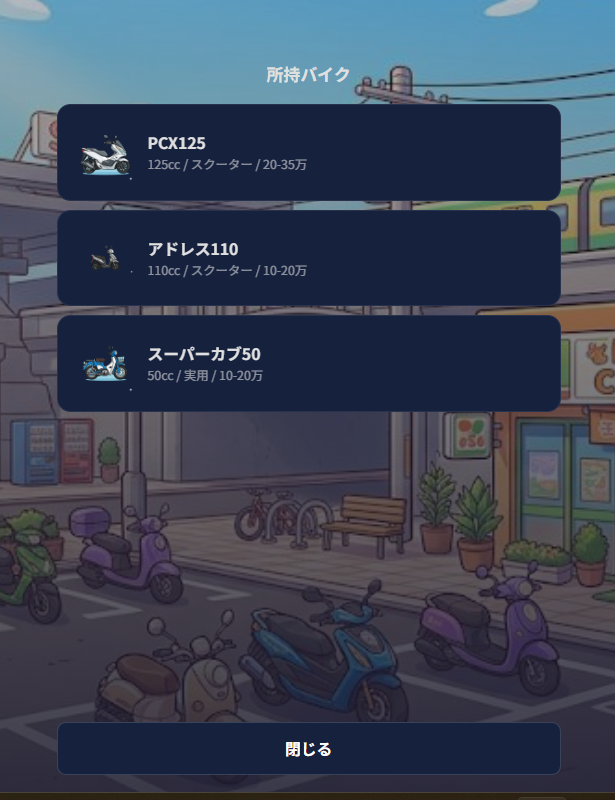 「わらしべ長者」の交換パズルをバイクに置き換えたゲームデザインです。誰に何を渡せばいいかを考えるパズル性と、個性的なライダーたちとの会話を楽しめます。バイクの価格や人気度は実データに基づいており、遊びながら「このバイク実際いくらするんだろう?」と興味が湧く作りになっています。