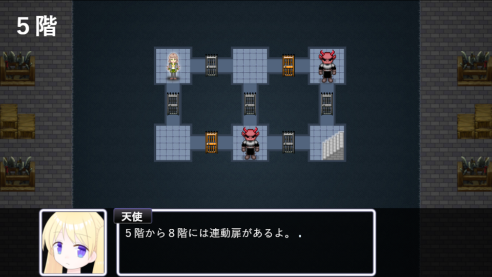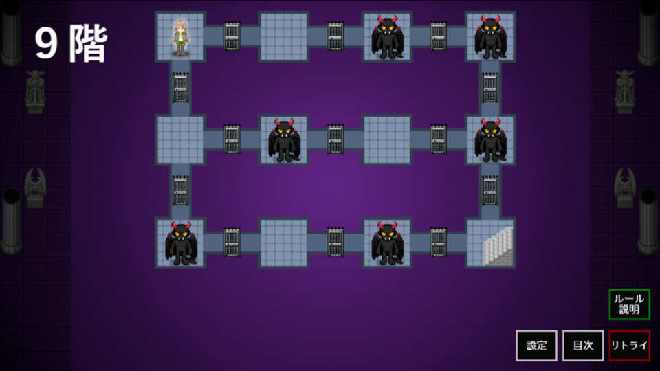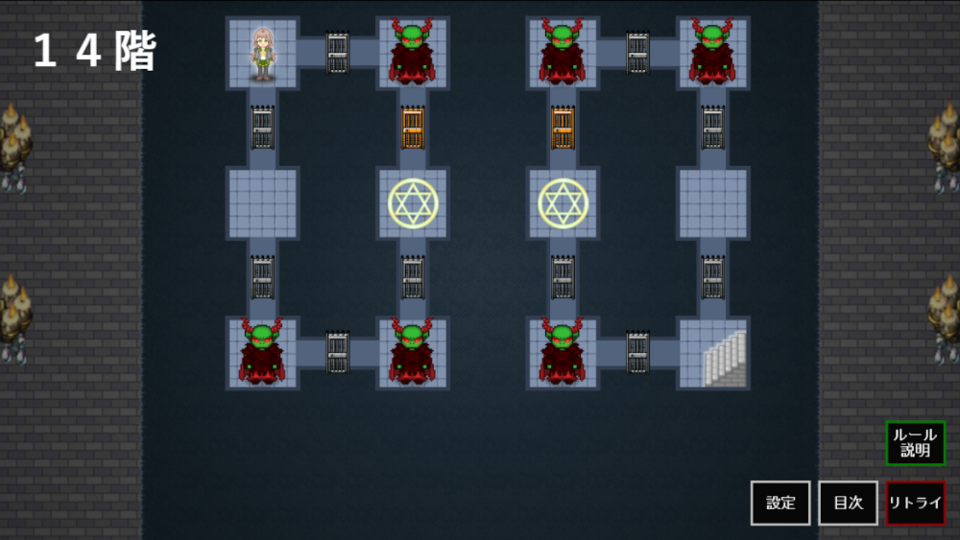 扉を開閉してモンスターを避けて進む。簡単パズルゲーム