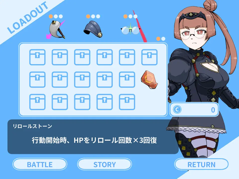 戦闘結果で入手したコインでアイテムを購入→装備でパワーアップできます。