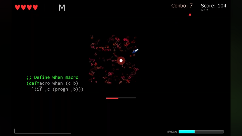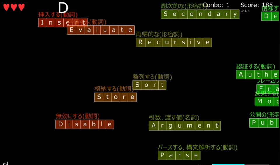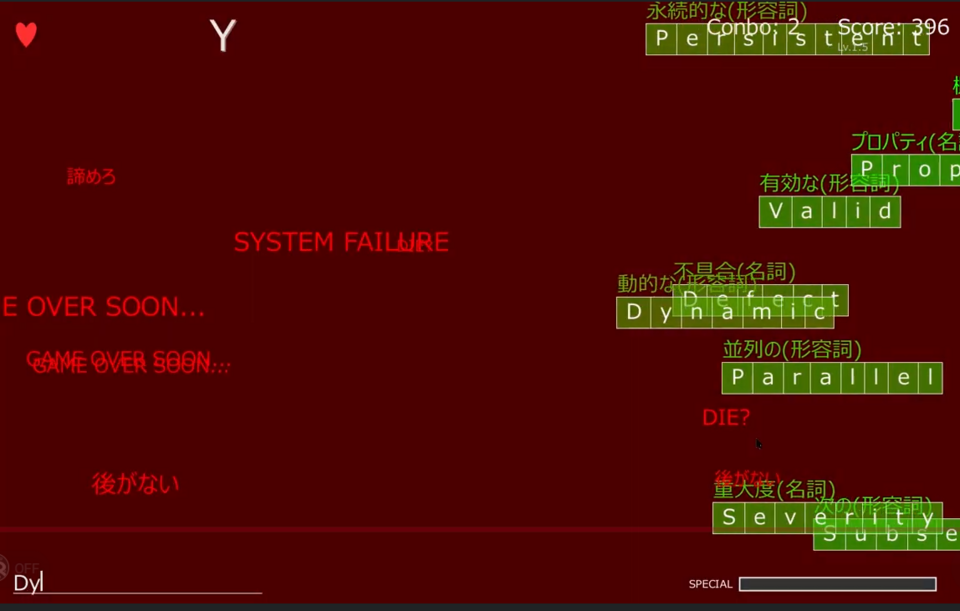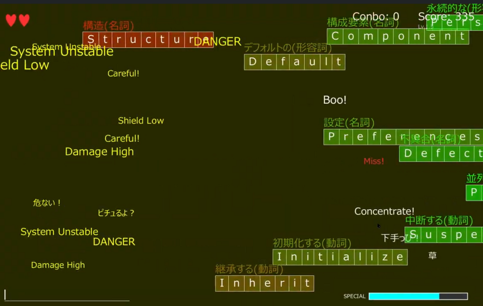 画面右から流れてくる単語を素早くタイプして撃破しましょう!