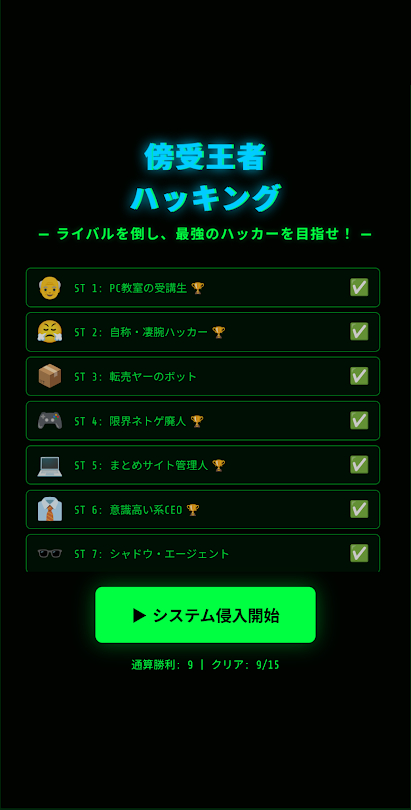 漆黒のデジタル空間でライバルをなぎ倒し、最強のハッカーを目指す電脳アクションです。シンプルながら中毒性の高い、0と1の格闘技を体感してください!