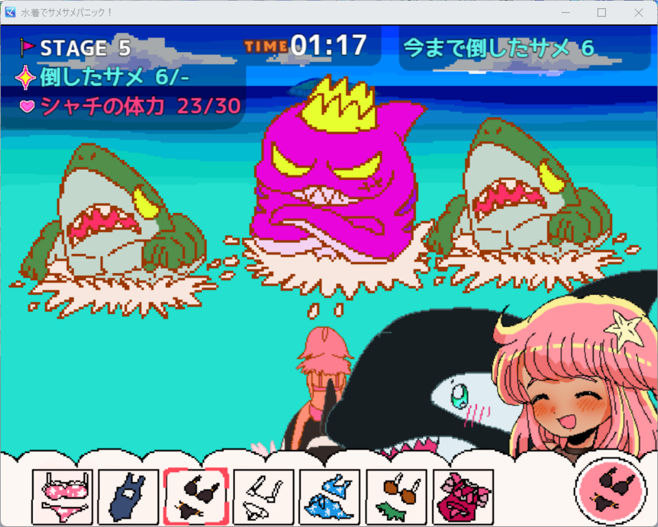 いろんな能力の【水着】を素早く着がえてサメを倒しまくろう!