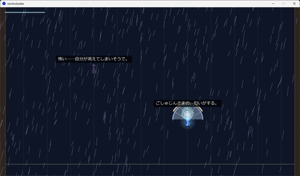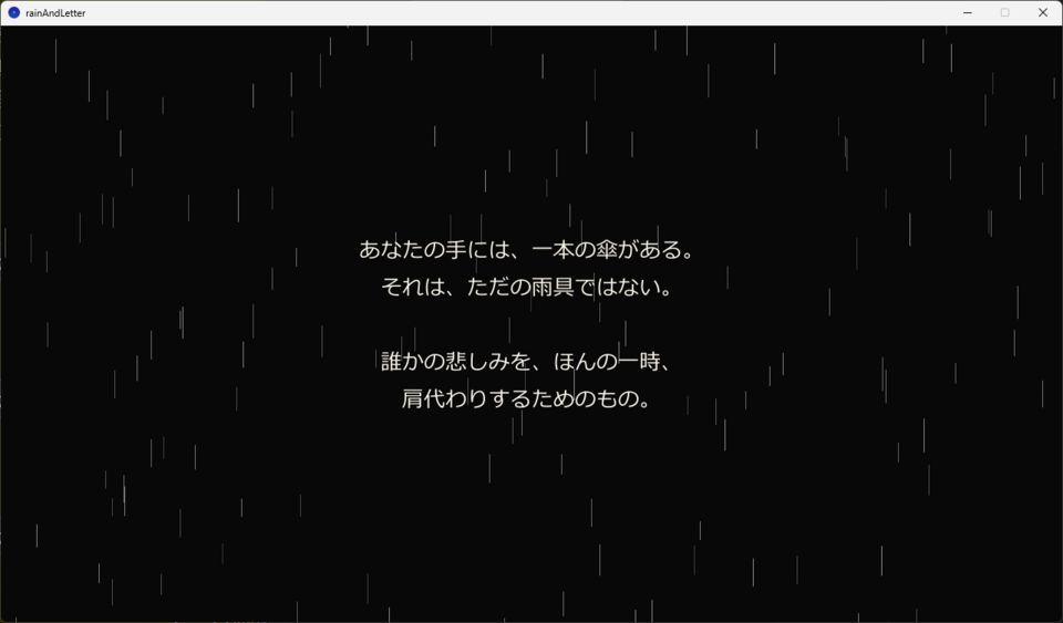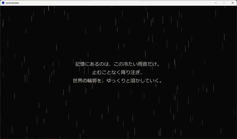 フルスクラッチ開発:既存エンジンを使わず、Processing(Java)のコードのみで雨と心の世界を描き出しました。
