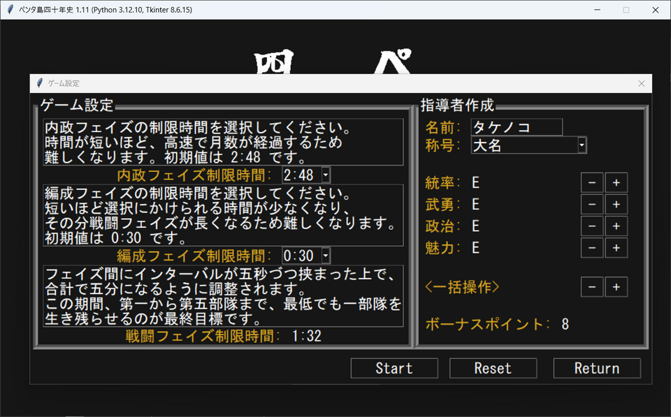 名前、称号、能力値、制限時間設定を記録し、リスタート時や次回起動時に再現するように変更。リセットで初期設定に戻せます。