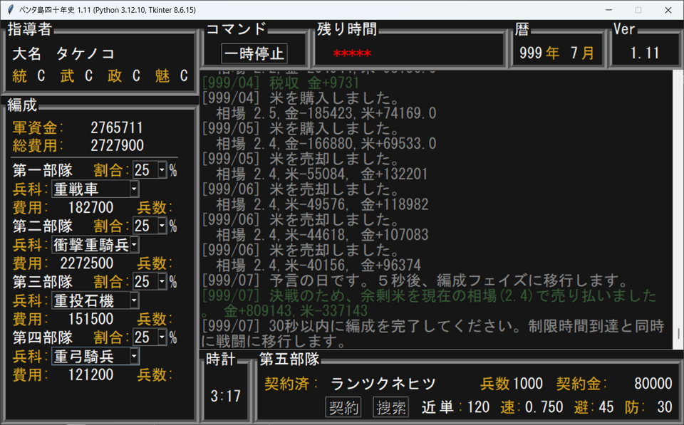 内政、編成、防衛戦全てを合わせて五分間で、内政と編成の時間はプレイヤーが調節することができます。