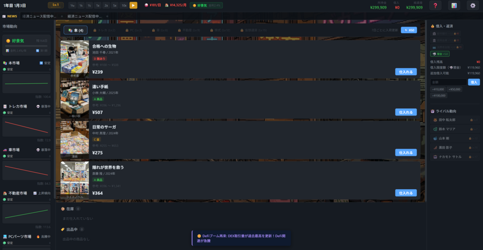 「転売王国」は、ランダム生成される商品を自分の目で見極め、仕入れて、値段をつけて売る――プレイヤーの判断がすべてのリアル転売シミュレーションゲームです。