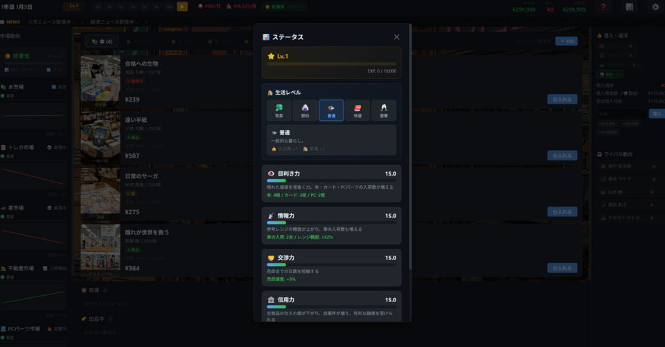 目利き・情報力・交渉力・信用・精神力――5つのステータスが裏側であなたの判断を支えます。