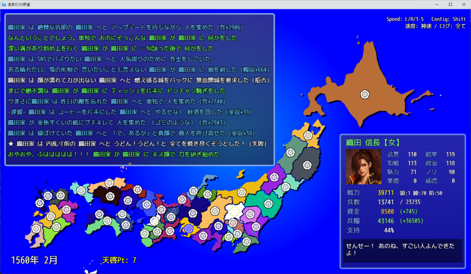 各勢力は「魔王」「引きこもり」「豪商」といった独自のAIを持ち、勝手に内政や戦争、裏工作を行い独自の歴史を紡いでいきます。プレイヤーはポイント(TP)を消費して「天啓」を下し、推しに資源を与えたり、方針を指示したり、時には敵に雷を落としたりと、間接的な介入を行うことで推しの天下統一をサポートします。
