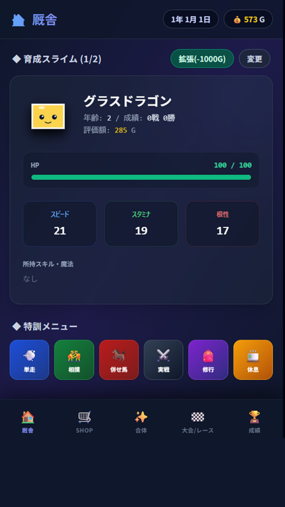 スライムを育成し、レースで勝利を目指す育成RPGです。