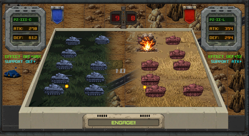 地形効果・射程・攻撃支援・挟撃など、戦術的判断が勝敗を左右する。