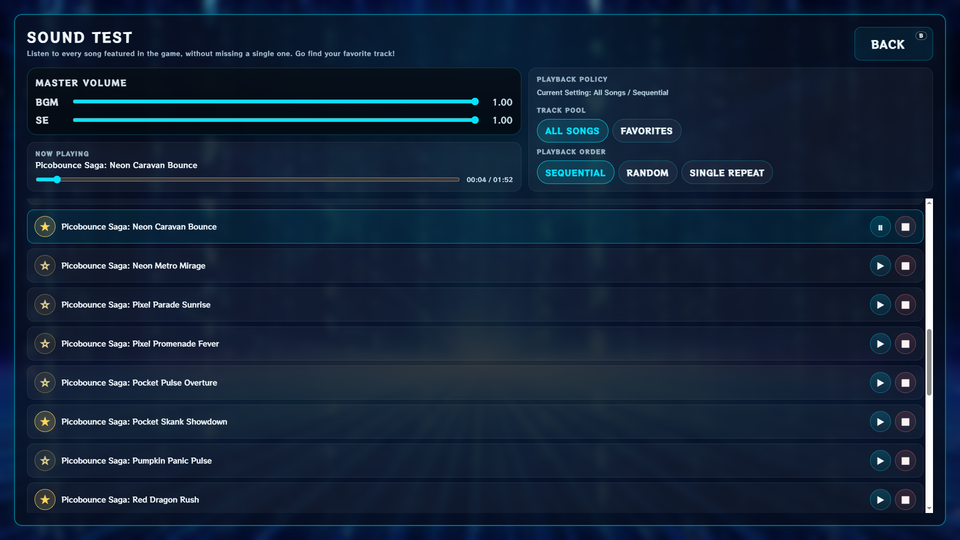 サウンドテスト、強化ショップ、レコード、ゲームクリア後のエンディングソング