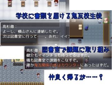 放課後の鬼瓦村の図書室、課題に取り組む鬼瓦校生。