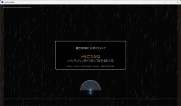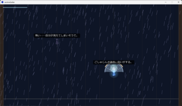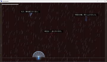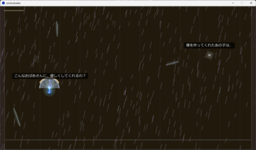 Rain and Letter あなたの傘で、誰かの心を救うRPG 投稿者aaaaaaaaa 投稿日2026年 2月 22日 このゲームは評価ならびにコメントを受け付けていません。 終わらない雨が降る世界。人々はそれぞれの悲しみや後悔、孤独を抱え、冷たい雨に打たれ続けています。本作『Rain and Letter』は、唯一「傘」を持つ旅人となり、彼らの心の雨を凌ぐハートフルアクションRPGです。降り注ぐ雨風を避けながら、フィールドに佇む人々の元へ向かいましょう。傘を差し掛け、彼らの痛みを防ぐこと。それがあなたにできる救済です。しかし、他者を救うたび、あなたの傘は少しずつ小さく、脆くなっていきます。身を削りながら進むこの道の果てで、あなたが最後に出会うものとは——。【おすすめポイント】心温まるストーリー: 傷ついた人々の独白を聞き、寄り添うことで物語が進行します。直感的なアクション: キーボード操作で雨風を凌ぎながら進む、シンプルかつ緊張感のあるゲーム性。美しい世界観: 降りしきる雨の音と、どこか切ないピアノのBGMが没入感を高めます。これは、傷ついた誰かと、あなた自身のための物語。冷たい雨の世界で、あなたの優しさを試してみませんか? プロローグ2 タイトル画面 このゲームのポイント クリア時間:25分~40分程度ハートフルアクションRPG: 傷ついた人々の独白を聞き、寄り添うことで物語が進行します。フルスクラッチ開発:既存エンジンを使わず、Processing(Java)のコードのみで雨と心の世界を描き出しました。余白を想像力で満たす:あえて写実的なキャラクター画像や派手な演出を削ぎ落としています。直感的なアクション: キーボード操作で雨風を凌ぎながら進む、シンプルかつ緊張感のあるゲーム性。 YouTube動画 注目してほしい点 他者を救うほど自分(傘)が削れていく「ジレンマ」と、あえて画像を排し「プレイヤーの想像力と心」に直接語りかけるエモーショナルな体験の構築に最も力を入れました。 Rain and Letter 対応OS 11 頒布形態フリーウェア カテゴリロールプレイングゲーム 年齢制限全年齢 制作者aaaa 本体サイズ285MB Version0.1.0 最終更新日2026年2月22日 DL回数 お気に入り票0票 このゲームはパソコン用のファイルも提供しています。ゲームを遊びたい場合は、パソコンからアクセスしてください。 メールでパソコンにURLを送る