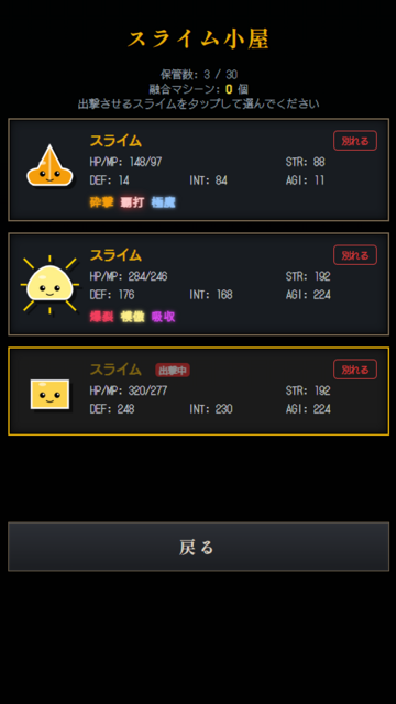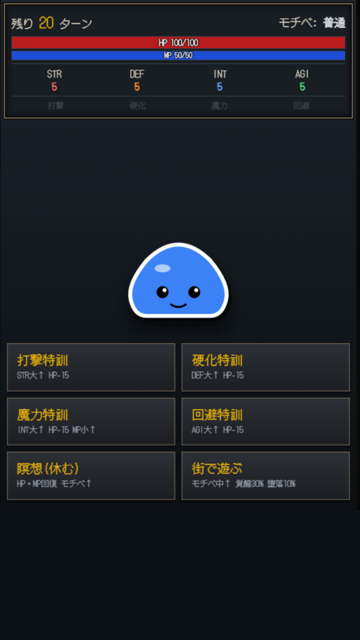 スライム育成RPG:最強進化への道 育てたスライムで果てなき連戦迷宮に挑む育成RPG 投稿者ましまろ 投稿日2026年 3月 26日 このゲームは評価ならびにコメントを受け付けていません。 スライムを特訓・進化!育てたスライムで果てなき連戦迷宮に挑む育成RPG。スキルを組み合わせて最強のスライムを作り出そう!【ゲーム概要】20ターンという限られた時間でスライムを特訓し、自分だけの最強スライムを育て上げる育成RPGです。ステータスの上げ方や習得したスキルによって、スライムは多種多様な姿へと進化します!手塩にかけて育て上げたスライムと共に、過酷な連戦が待ち受けるダンジョンを攻略しましょう!【主なゲームモード】■ 育成モード20ターンの中で「打撃」「硬化」「魔力」「回避」などの特訓を行い、スライムを鍛え上げます。スキルの閃き: 特訓を重ねることで様々なスキルを閃きます。スキルの融合: 複数の特定のスキルを覚えることで、強力な「進化スキル(爆裂撃、ガードブレイク、スナッチ、ドレインなど)」へと変化!多彩な進化: 育て方によって、「剣士」「乙女」「武道家」「天使」「悪魔」「ロボ」など、スライムの姿が変化します。20ターン経過後には「スライム王決定戦」が開催されます。大会を勝ち抜くと、育てたスライムが「スライム小屋」に登録され、冒険に連れ出すことができるようになります。■ ストーリーモード育てたスライムから1体を選び、立ち塞がる敵との連戦に挑みます。周辺警備、遠征出兵、迷宮攻略バトルは本格的なコマンド選択式!「オートバトル」にも対応しており、サクサク進めることも可能です。戦闘に勝利するたびに、HP・MP回復やステータス倍化などの「戦利品」を1つ選んで獲得できるローグライク要素も搭載。戦略的な選択が攻略の鍵を握ります。■ スライム小屋と「融合」育成を完了したスライムは、スライム小屋に最大30体まで保存可能です。迷宮攻略などでドロップする「融合マシーン」を使えば、スライム同士を融合させてさらに強化することができます!高いステータスを引き継ぎ、複数の強力なスキルを併せ持つ「最強のスライム」を生み出しましょう。【こんな人におすすめ】モンスター育成ゲームが好きな方限られたターンでのパラメータ振りやスキルビルドを考えるのが好きな方ローグライク要素のある連戦バトルを楽しみたい方ドット絵風のレトロなUIや雰囲気が好きな方やり込み要素(100階層の迷宮攻略、スキルコンプリート、融合による最強個体の作成)を求めている方自分だけの最強スライムを育成し、果てなき迷宮の最深部を目指せ! 街の長老が鍛えてくれる このゲームのポイント 10時間くらいでクリアできる見込み 注目してほしい点 確率や工夫によってより強いスライムを育成する! 制作者メッセージ シンプルで楽しく スライム育成RPG:最強進化への道 対応OS 頒布形態フリーウェア カテゴリロールプレイングゲーム 年齢制限全年齢 制作者ましまろ 制作サイトましまろnote 本体サイズ25MB Version1 最終更新日2026年3月25日 プレイ回数 お気に入り票0票 上記の本体サイズ程度に通信容量がかかりますので、モバイル回線の場合はWi-Fiに切り替えてご利用ください。また回線速度が遅いとゲーム起動までに時間がかかる場合があります。 セーブデータはお使いのブラウザに保存されます。ブラウザのキャッシュをクリアするとデータが消えてしまうこともありますのでご注意ください。 RPGツクールやティラノビルダー作品の場合は、仕様上セーブデータ領域がドメイン単位で共有されます。当サイトでプレイする他の同ツール作品と共有されますので、セーブする際は空いている箇所を使用するか、もしくは別のブラウザでプレイするなどで対応してください。