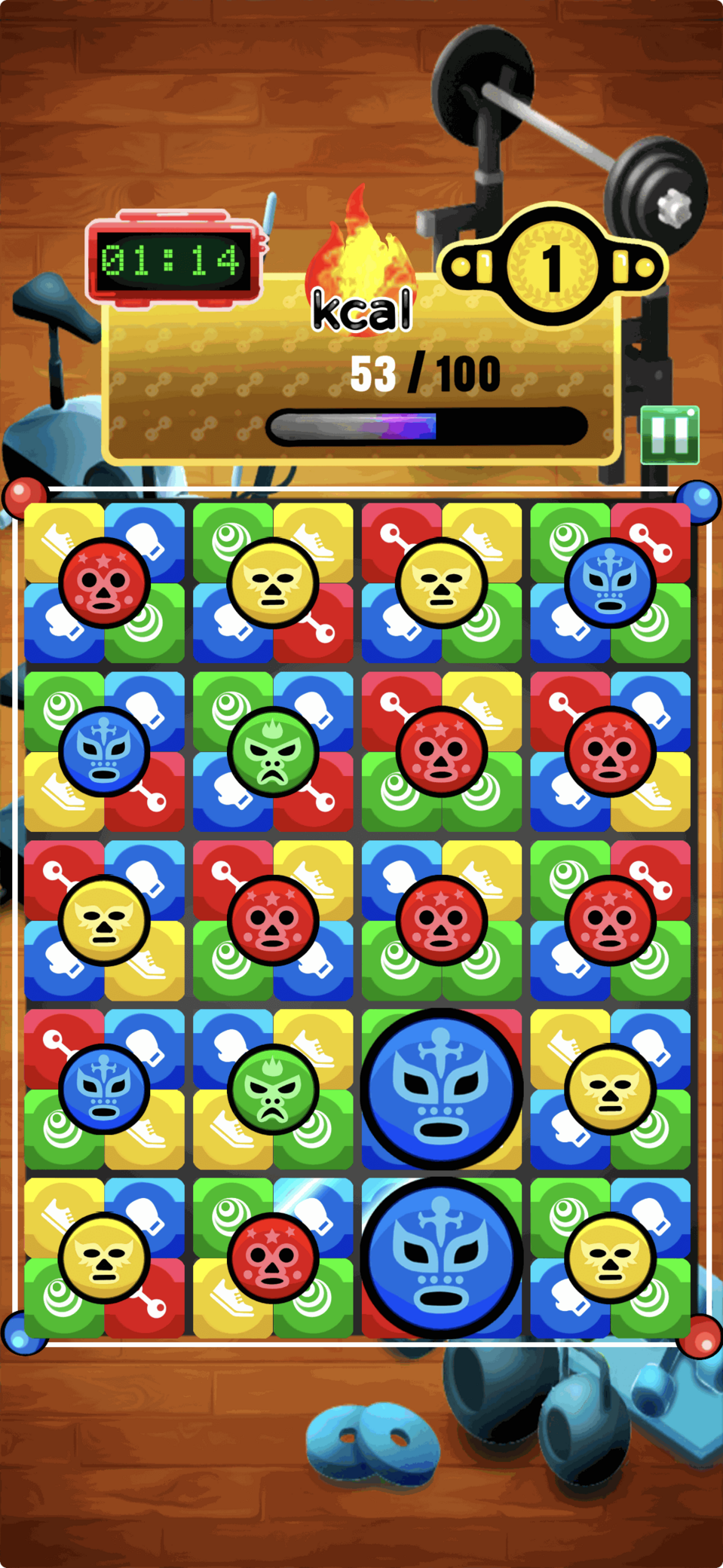 顔ボタンを含む同じ色のブロック4個が、縦か横に繋がると消えて、カロリーが消費され